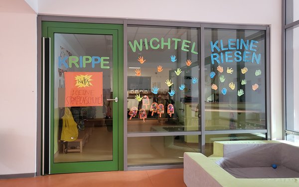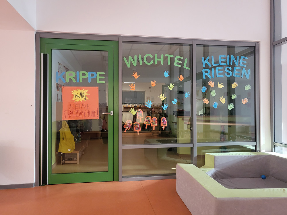 Die beiden Krippengruppen haben einen schönen großen Neubau bekommen, der über die Eingangshalle und den Flur mit den anderen Trakten verbunden ist. Zwei helle und große Gruppenräume laden zum Spielen, Erleben und Wohlfühlen ein. Beide Gruppen verfügen auch über je einen Schlafraum und ein Kinderbad. Von der Garderobe aus geht es auch auf das Außengelände, auf dem die Krippenkinder, etwas abgetrennt vom Kitagelände, ihren ganz eigenen Platz zum Toben und Erkunden haben.