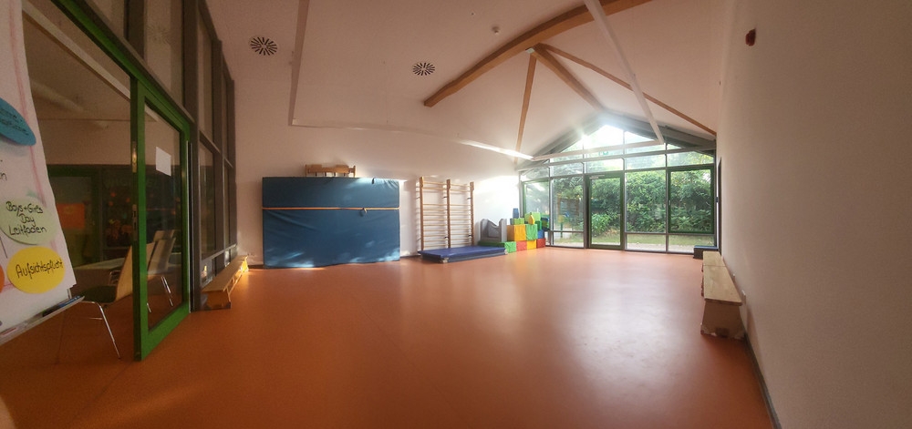 Im „alten“ Kindergartentrakt verfügen alle Gruppenräume über eine Hochebene und Galerie, mit der die Räume untereinander verbunden sind. Im Neubau wurde eine Bewegungshalle integriert, die von allen Gruppen genutzt werden kann.